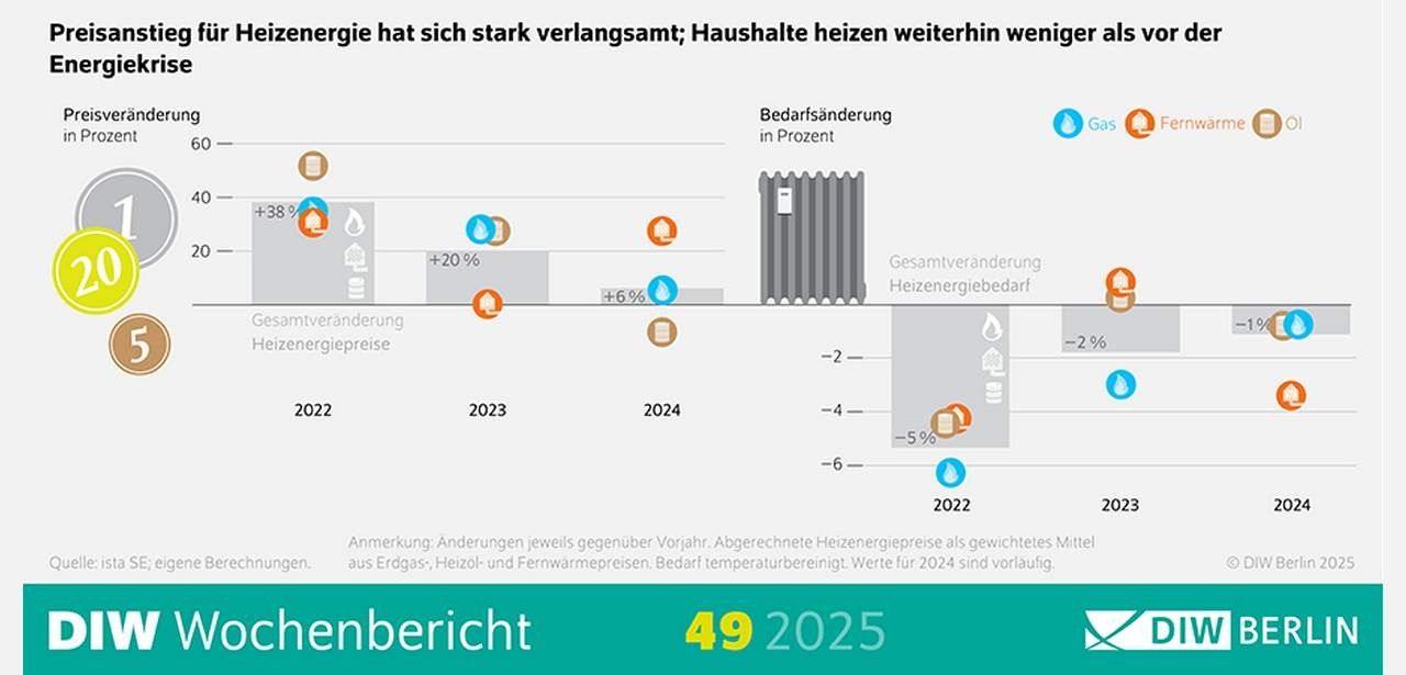Laut ISTA-Abrechnungen und DIW-Berechnungen erhöhte sich der gewichtete Mittelwert der Heizenergiepreise 2024 gegenüber 2023 nur noch um rund sechs Prozent. Im Jahr zuvor war der Anstieg mit 20 Prozent deutlich höher, 2022 lag er bei 38 Prozent. Diese langsamer verlaufende Teuerung spiegelt sich im Durchschnitt aus Erdgas-, Heizöl- und Fernwärmepreisen wider. Grundlage für die Analyse sind reale Verbrauchsabrechnungen zahlreicher Zwei- und Mehrparteienhäuser sowie detaillierte ökonomische Modellierungen. Damit untermauert die Auswertung die Beruhigung der Preisdynamik im Heizenergiebereich.